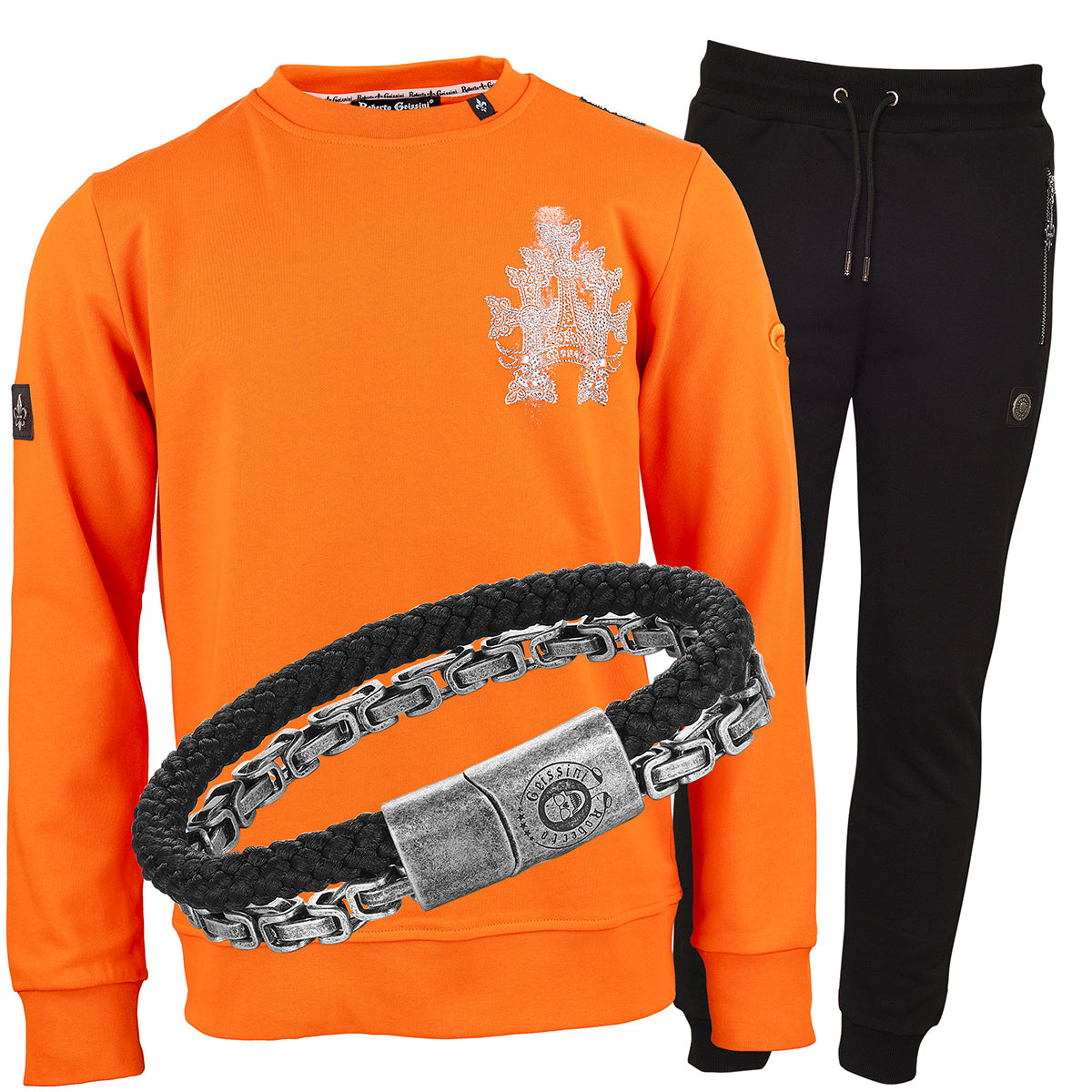 Material: Sweatshirt: 92% Baumwolle 8% Polyester Jogginghose: 100% Baumwolle Armband: Edelstahl (Verschluss) Nylon (Seil)