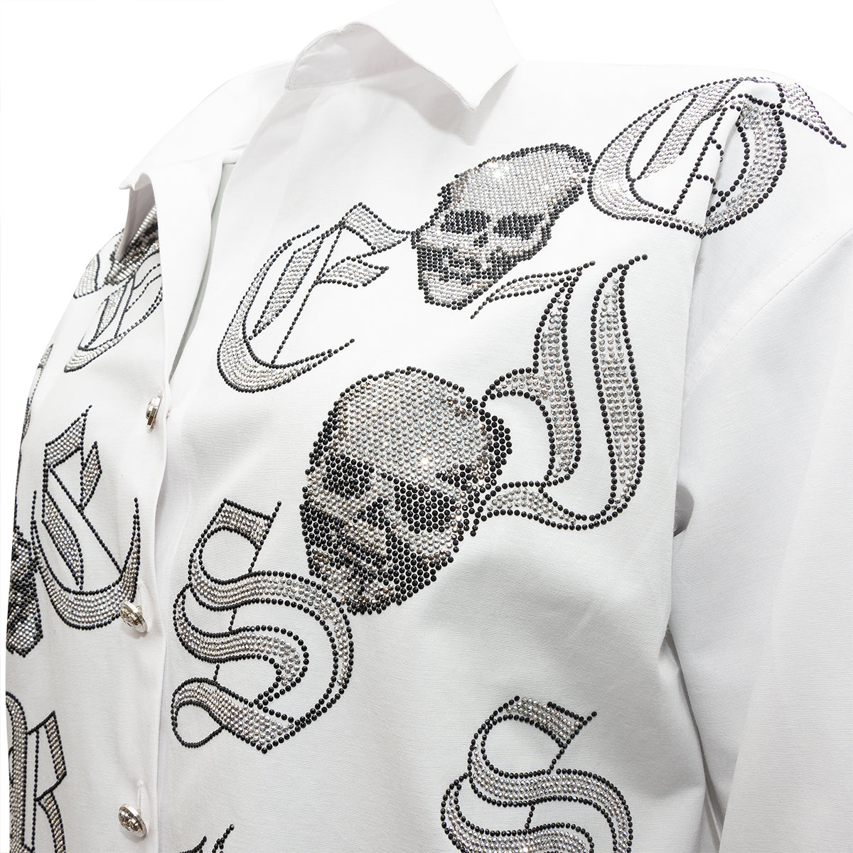 Vrcholom blúzky "Carmen" sú početné lebky, ktoré sú umne zdobené trblietavými kamienkami. Tieto lebky dodávajú blúzke nádych rebélie a sú silným prejavom.