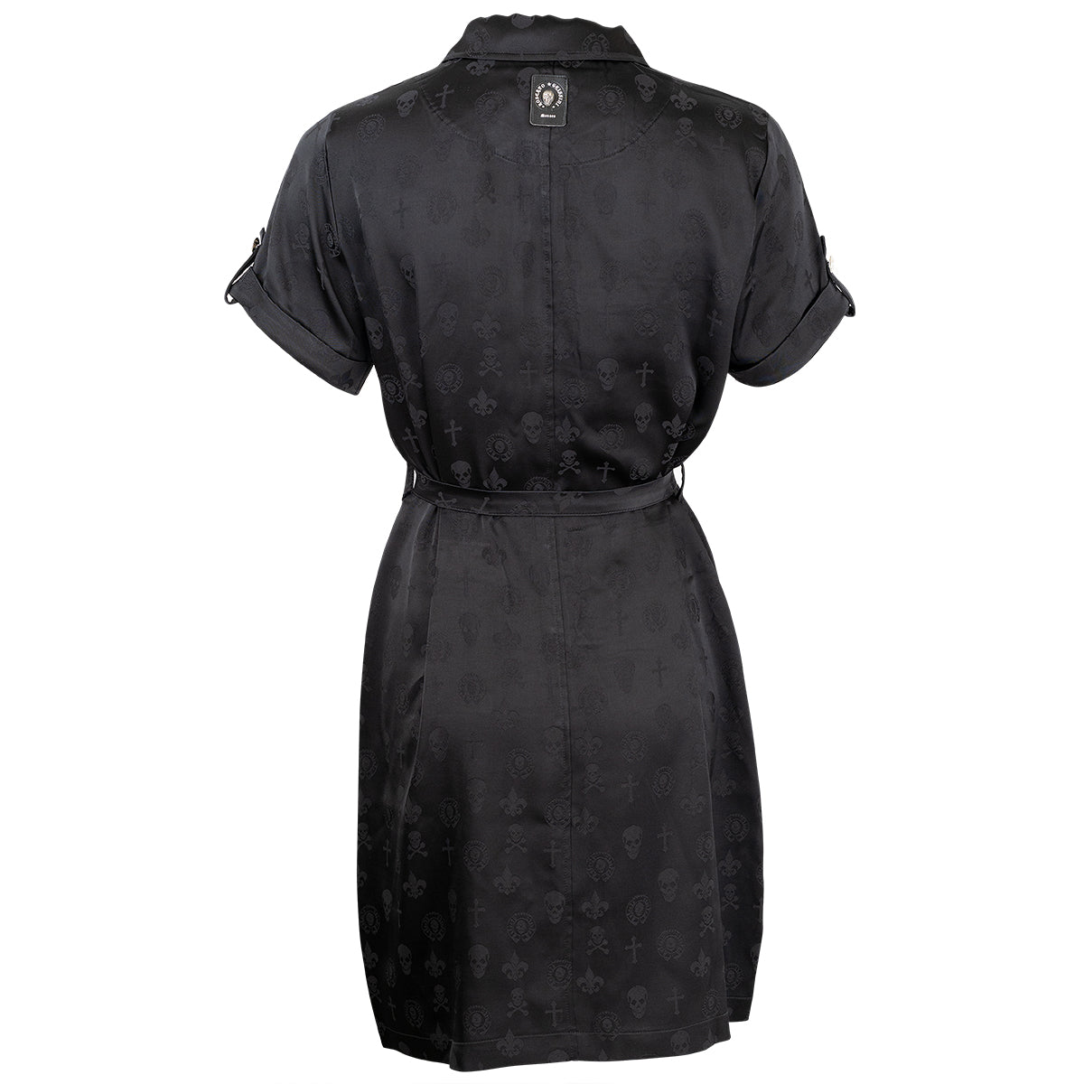 Objavte lákavé kúzlo dámskych šiat „Charme“. Dizajn obsahuje vyšívaný vzor lebiek, ľalií, krížikov a okrúhle logo RG, ktoré dodáva šatám jedinečný nádych.