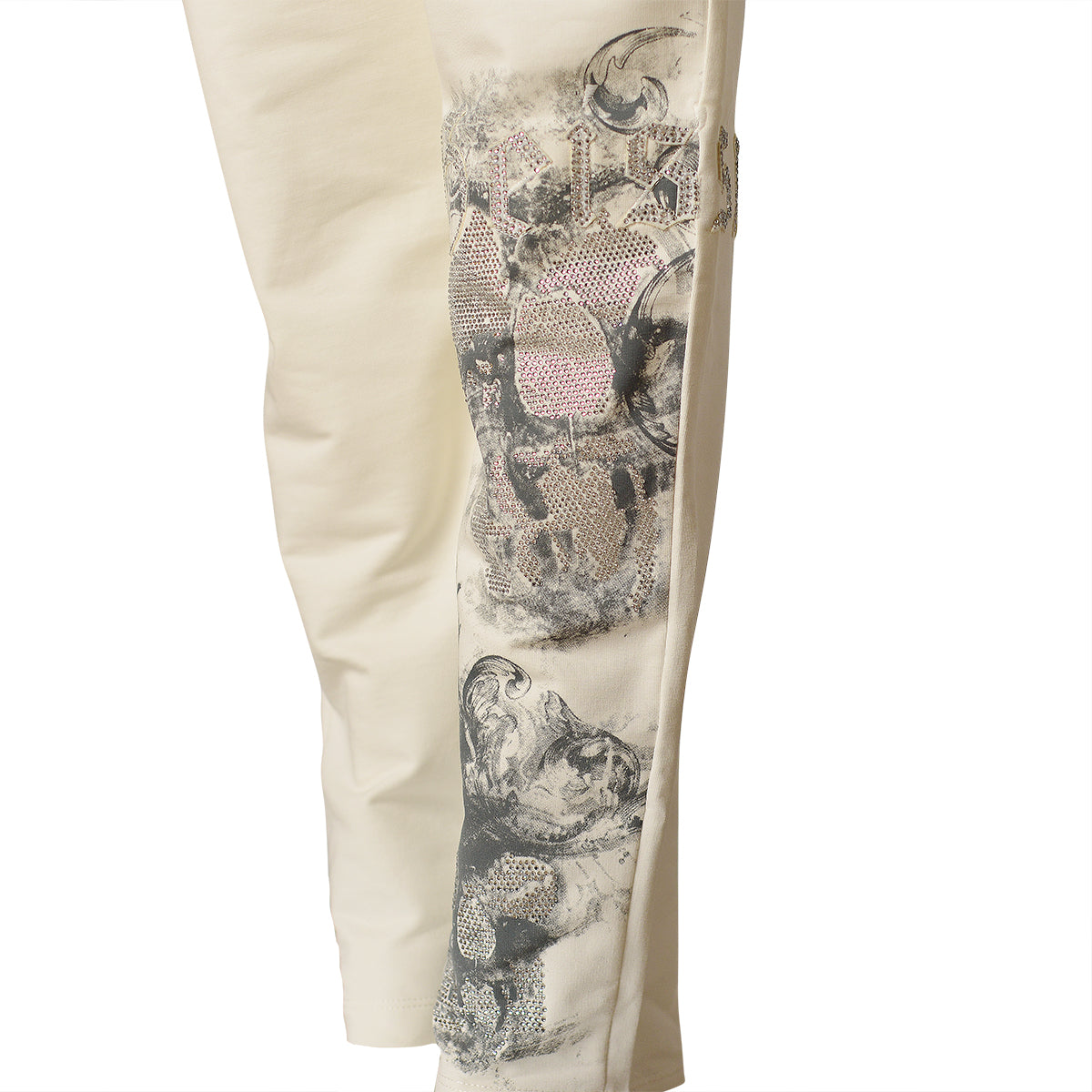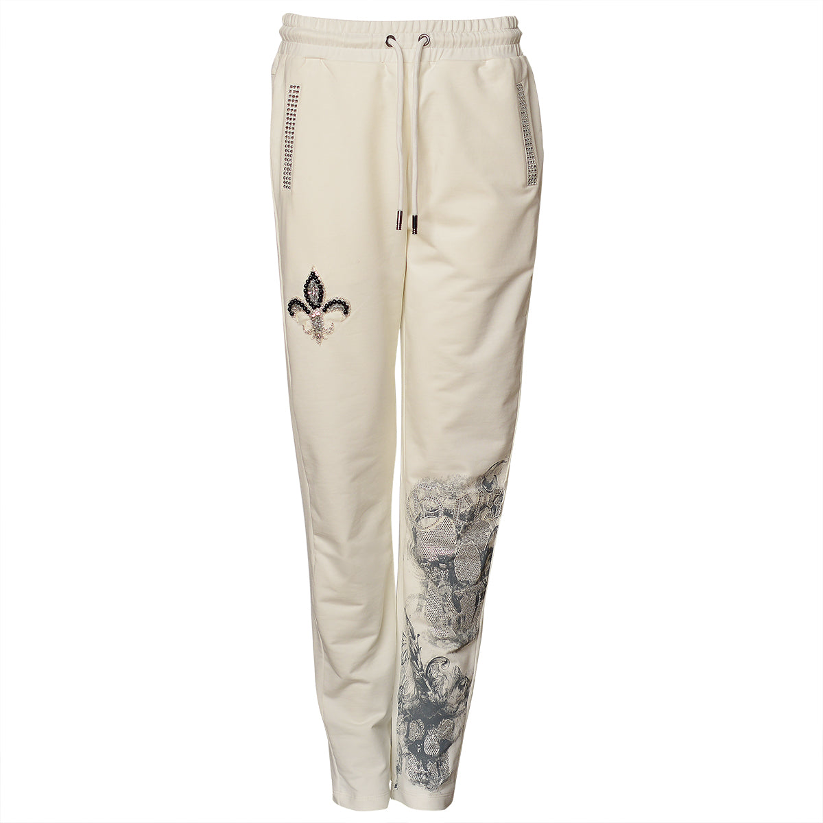 Spodná predná časť ľavej nohavice je potlačená umeleckým kvetinovým aranžmánom. Kvetinový dizajn dodáva joggingovým nohaviciam hravý nádych a dodáva vzhľadu nádych ľahkosti. Aj tu sú luxusné akcenty osadené kamienkami.