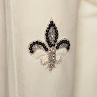 Na vrchnej prednej časti pravej nohy sa skvie štýlová ľalia zdobená trblietavými kamienkami a ručne vyšívanými korálkami.