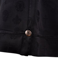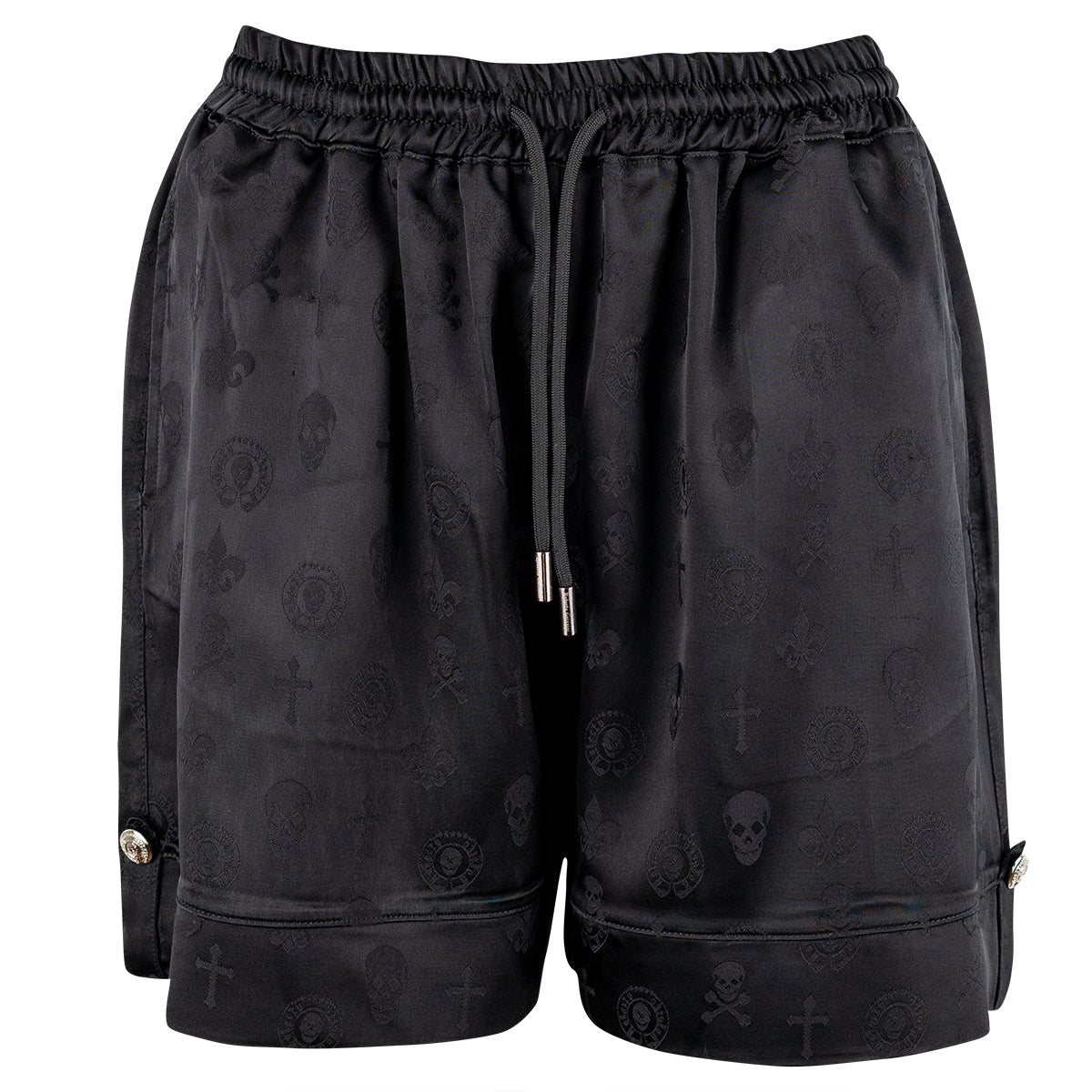 Na oboch stranách šortiek sú strieborné gombíky RG, ktoré dodávajú dizajnu elegantný nádych. Vzor šortiek pozostáva z okrúhleho loga RG, lebiek, ľalií a krížikov, ktoré vytvárajú jedinečný vzhľad.