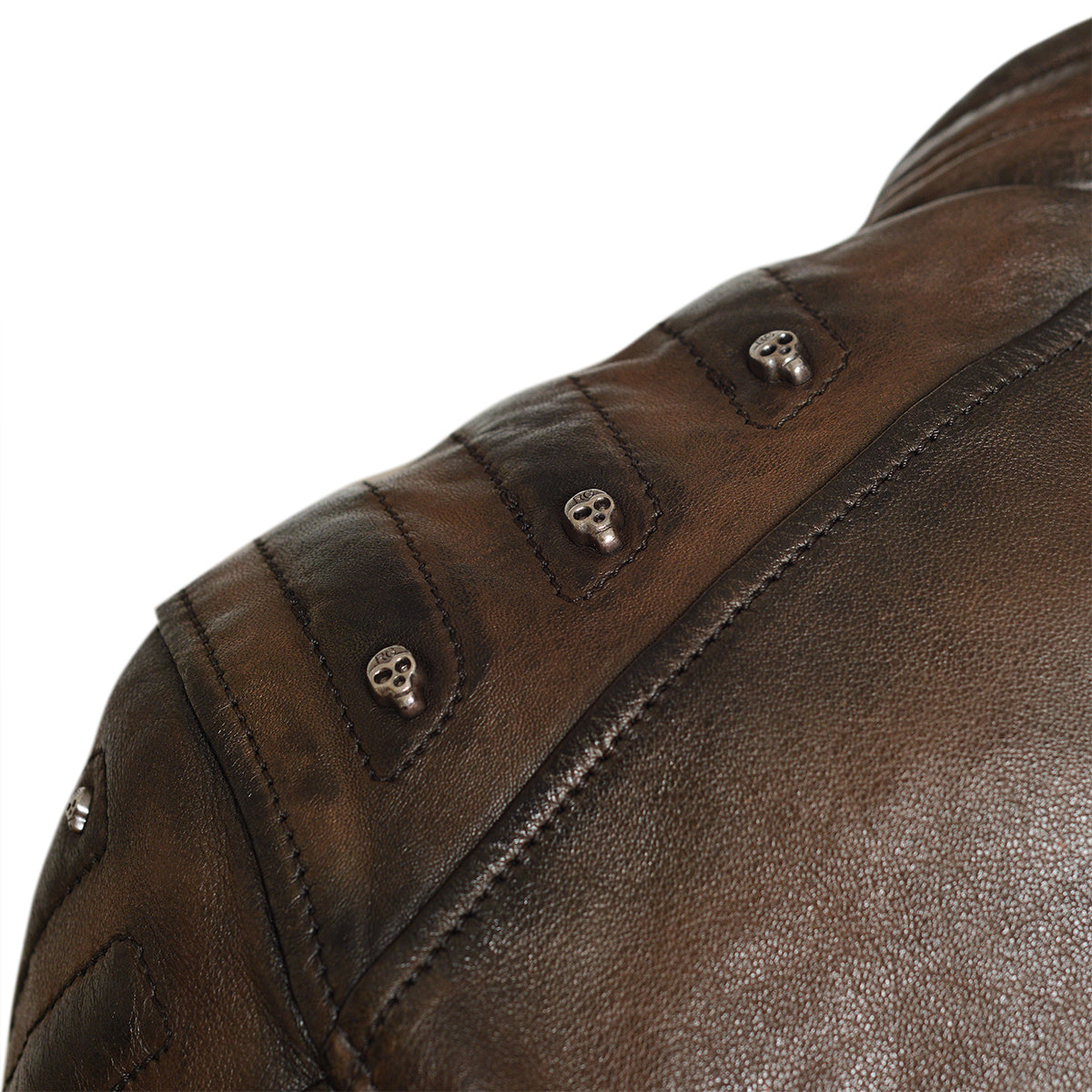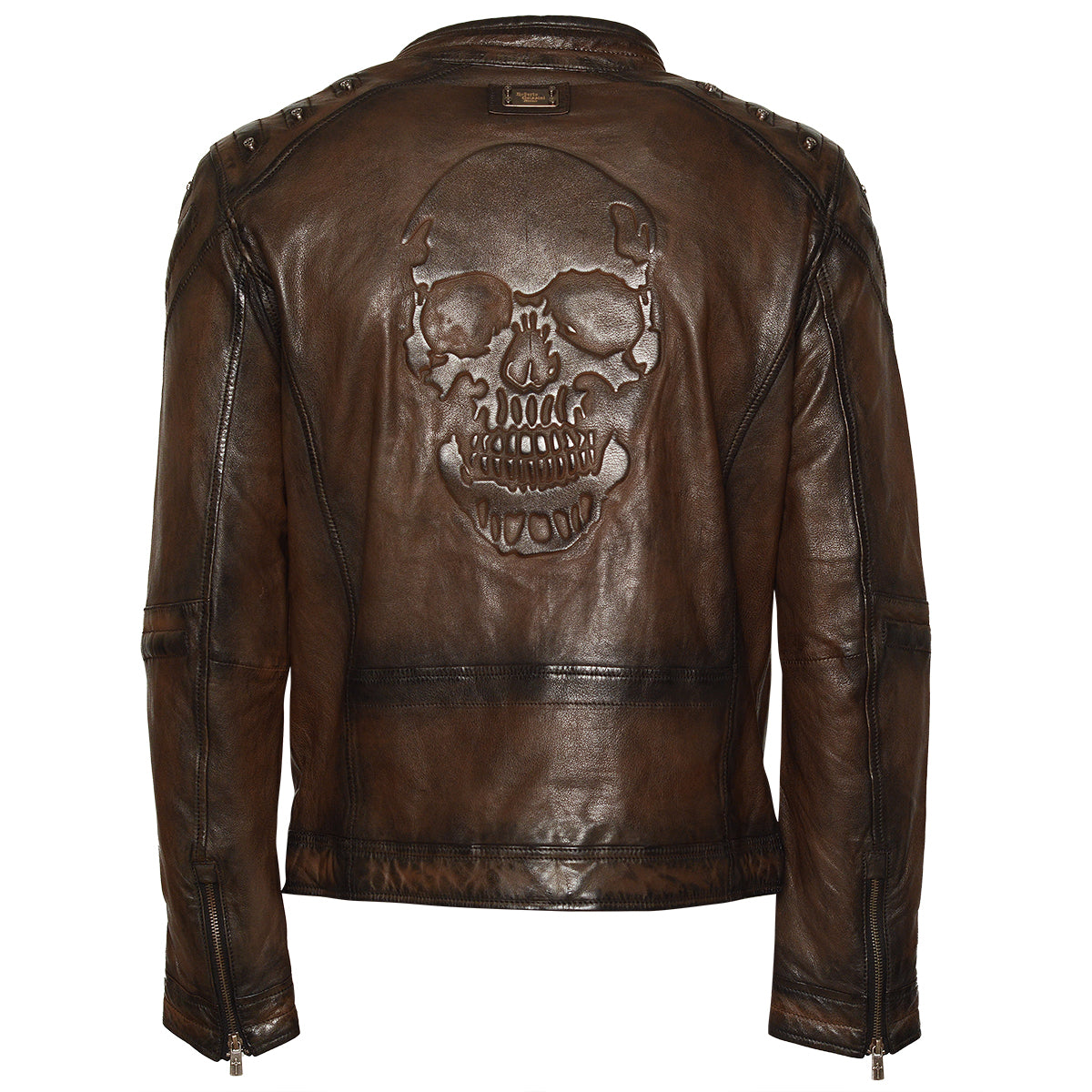 Veľká lebka na chrbte, vytvorená špeciálnou technikou tlače, stelesňuje absolútny vrchol koženej bundy.