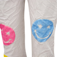 Objavte nohavice na dobrú náladu „Smile“ – biele dámske džínsy so vzhľadom pokrčenej látky, ktoré zaisťujú čistú radosť zo života. Voľný strih a nastaviteľný pás, ktorý sa pohodlne zapína pomocou bielej šnúrky, ponúkajú maximálny komfort a flexibilitu. Na prednej strane každej nohavice sú tri farebné smajlíky, ktoré sú našité ako farebné látkové nášivky a dodávajú džínsom veselý, jedinečný vzhľad.