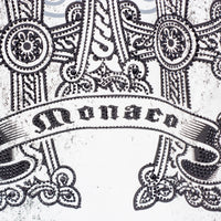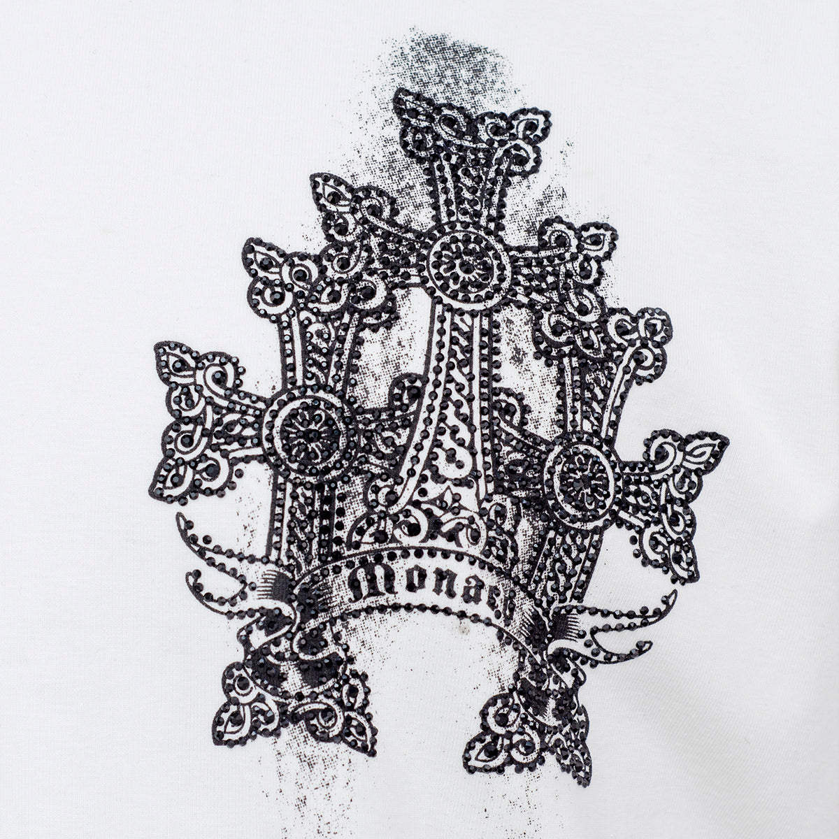 - Trblietavý melír: Kríže zdobené čiernymi kamienkami sa trblietajú na prednej strane trička, sprevádzané nápisom „Monaco“.