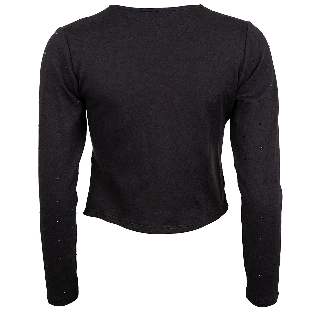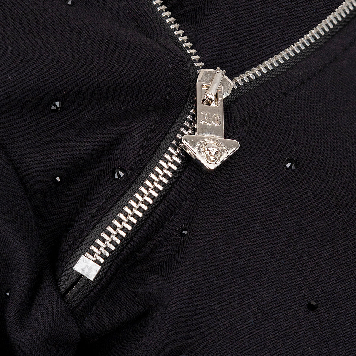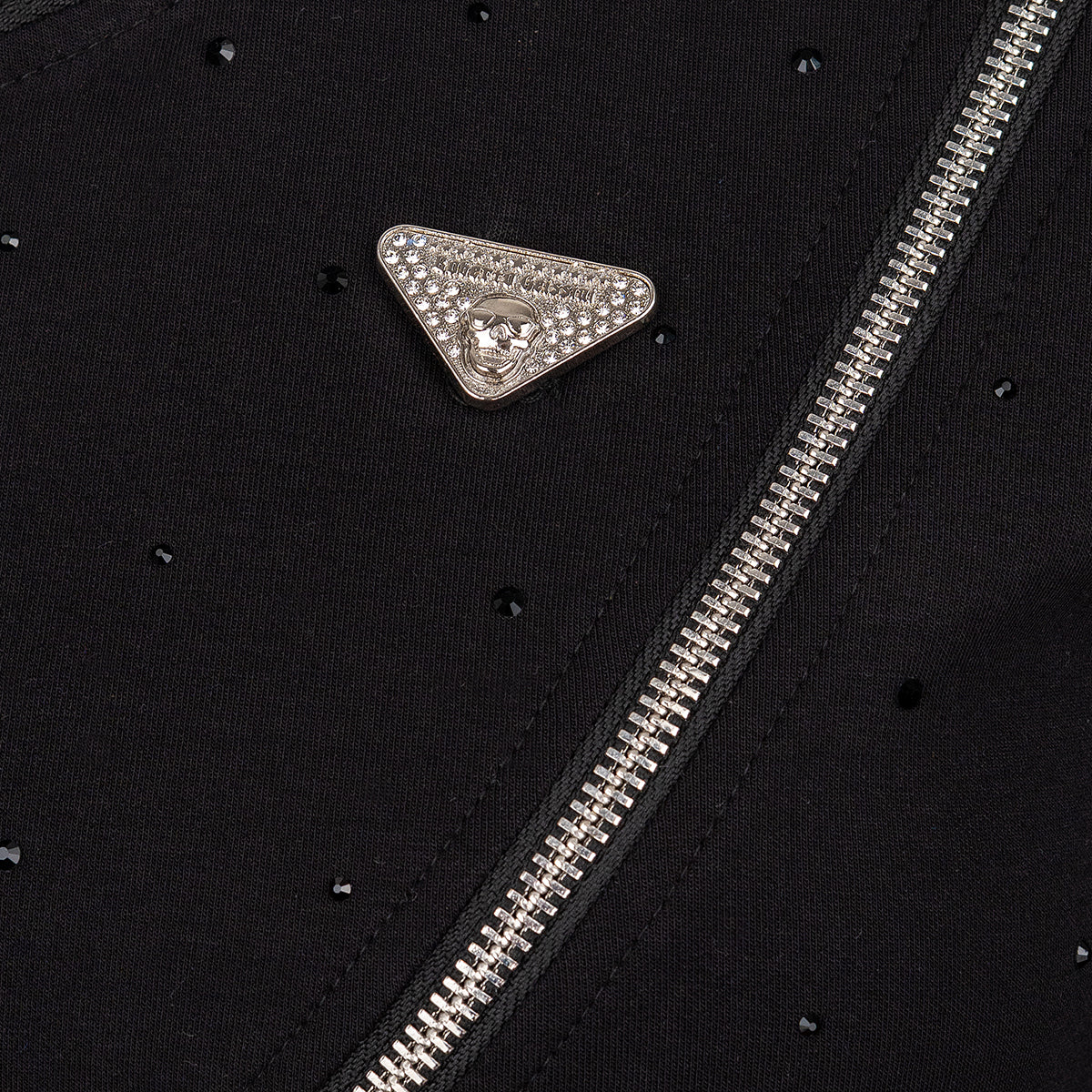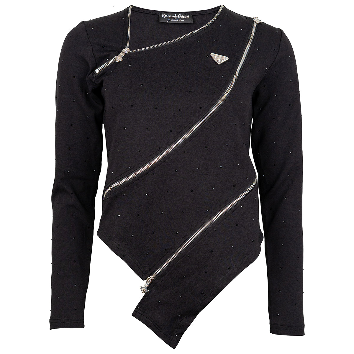 Dieses Oberteil ist ein echtes Statement-Piece – modern und voller Roberto-Geissini-Attitüde. Der schräge Zipp-Look und die funkelnden Strassdetails machen es zu einem Fashion-Highlight, das garantiert alle Blicke auf sich zieht.