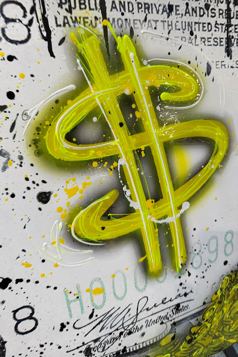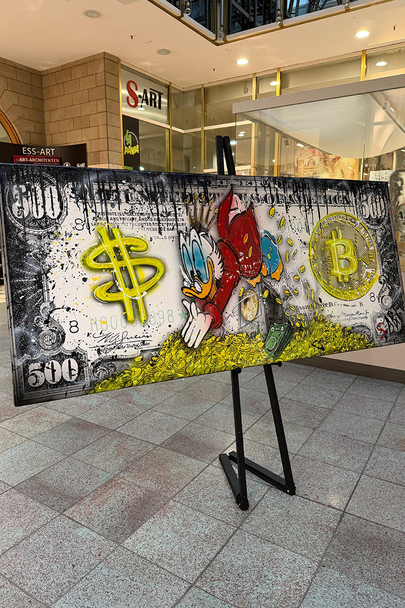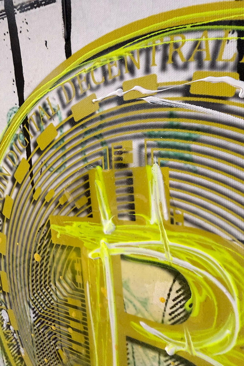 Mit unterschiedlichen Drucktechniken, Sieb Digital und Schablone erstellt. Mit Spraydosen gesprüht für die Leichtigkeit, spontane Acrylmalerei für die Explosivität und eine partielle Harz und Glitter-versiegelung für Tiefe und Glanz der Bilder.